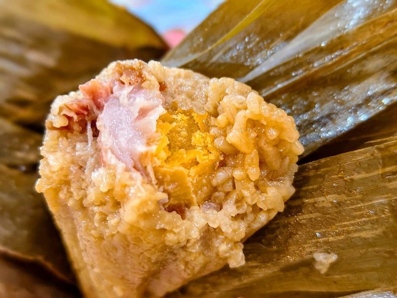 蛋黃款在鮮肉粽的基礎上加入整顆鹹蛋黃,蒸後呈現細沙質地,咬下時與豬肉油脂一同化開。鹹蛋黃的香氣讓整體味道更立體,鹹香、油潤、甜度與米香逐層堆疊,是老客人最常指定的口味之一,也是南門市場採買時絕不能漏掉的款式。