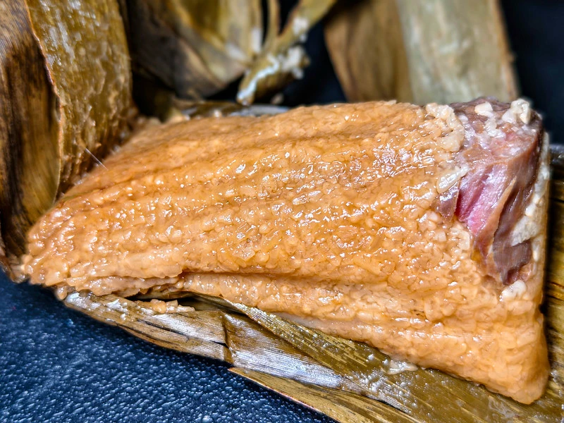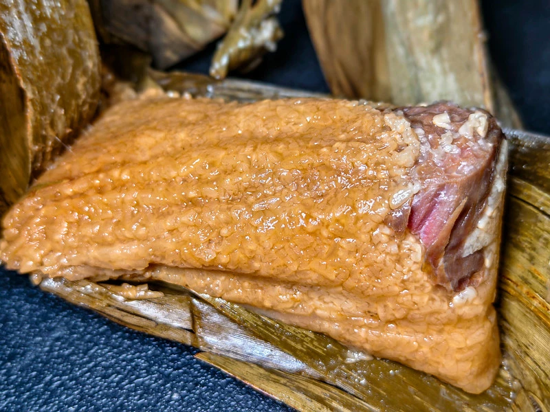 剝開竹葉後,圓糯米呈現半糊化的油亮質地,是湖州粽最大的特徵。鮮肉粽採用黑毛豬梅花肉,肥瘦恰好,經過長時間與糯米同煮,油脂完全滲入米粒。入口是軟糯帶黏、鹹香融合的口感,不需要任何醬料,就是江浙人熟悉的家常味道。