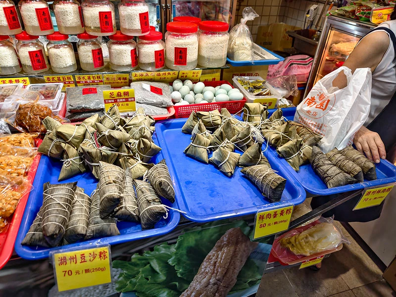 南園老店鍾記湖州粽落腳南門市場多年,以傳承四代的江浙家鄉味聞名。長條形湖州粽米香黏潤、肉餡鹹香入味,是許多老饕逛市場時的例行採買。