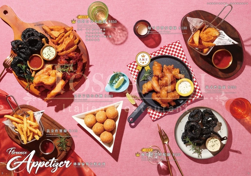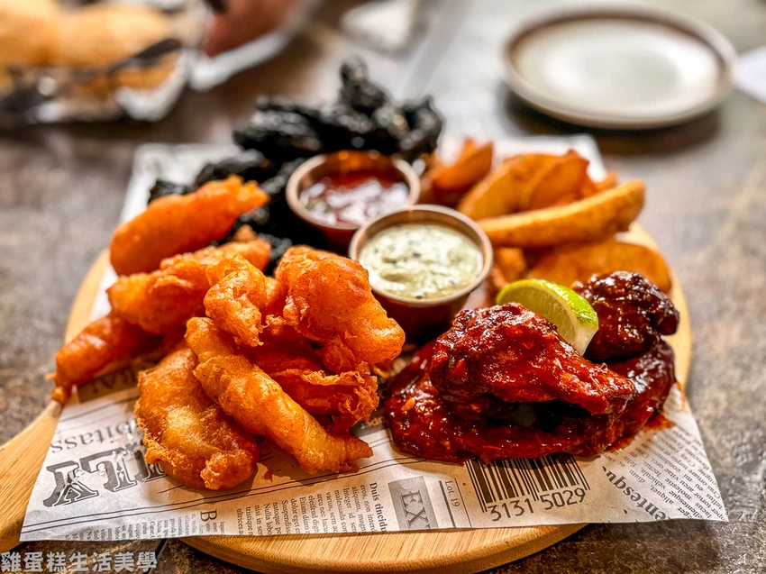 ▲派對分享大拼盤 650元:一次可以吃到匈牙利帶皮薯條、酥炸黑墨鮮魷圈、羅馬辣雞翅、義式炸魚條四種不同種類炸物,並搭配兩種不同風味沾醬,炸物外皮酥脆不油膩,海陸兩棲一次滿足,很適合多人分食。