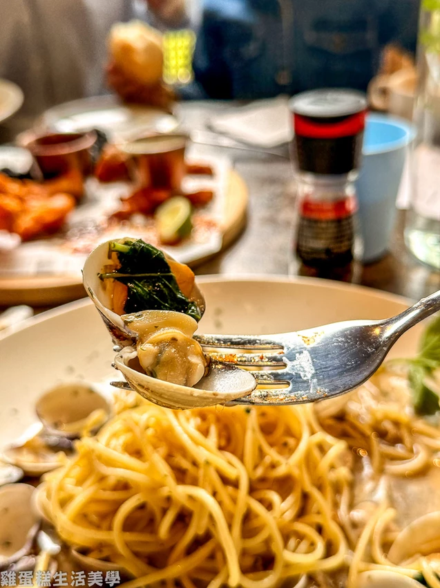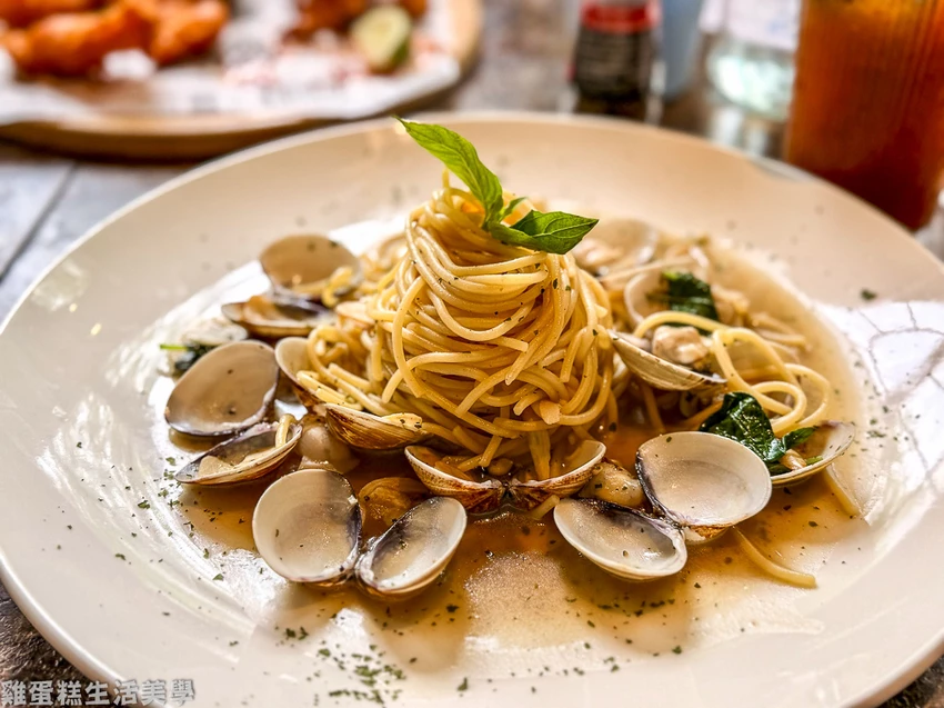 ▲蒜香白酒蛤蠣義大利麵 290元:這道也是店內人氣必點,蛤蠣外殼鋪在盤上底層,義大利麵鋪在第二層,視覺效果鮮明有層次,蛤蠣各個大顆又鮮美,與九層塔和蒜香一起吃超搭,非常清爽。