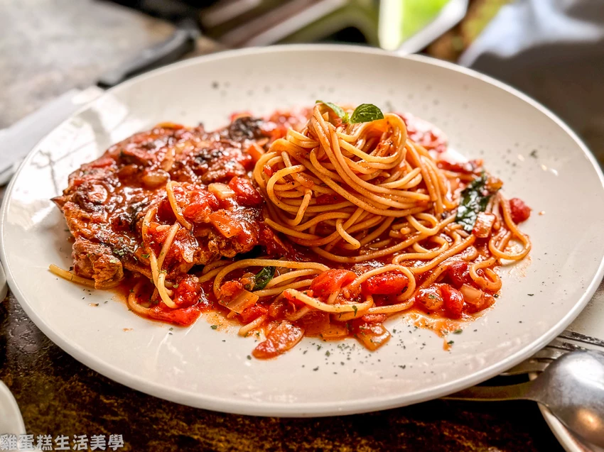 ▲紅茄義式香料雞腿義大利麵 360元:紅醬義大麵充滿茄汁風味,醬汁還有帶皮的番茄果肉,麵條充分吸附醬汁非常夠味,雞腿肉質鮮嫩多汁完全沒有乾柴感,紅醬完全吃進肉內味道充足。