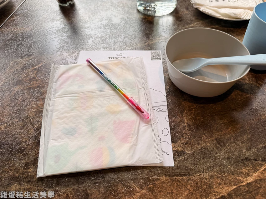 ▲當天帶小朋友用餐還送上蠟筆、繪圖紙和紙圍兜,店內也提供兒童餐具和兒童高腳椅,對有小孩的家庭非常友善。
