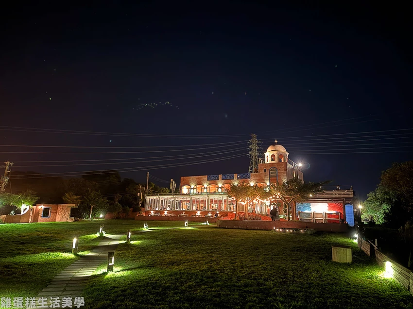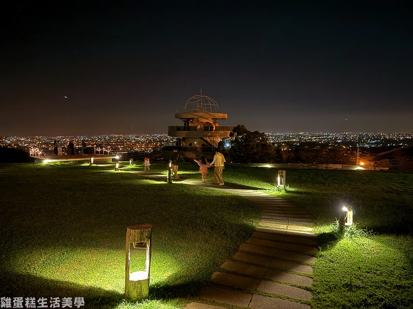 ▲一樓戶外區有寬闊的草原,蜿蜒的小徑鏡頭是一望無際的夜景,還能看到遠處桃園機場飛機起降,視野很遼闊。
