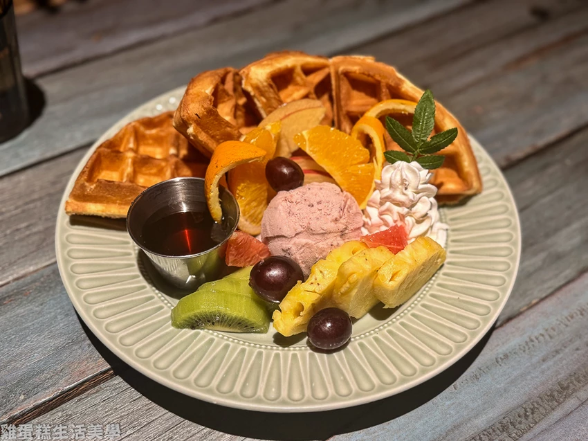 ▲蜂蜜水果鬆餅 350元:鬆餅烤得外酥內軟,附上蜂蜜和奶油搭配,冰淇淋是莓果口味有濃郁果香,其他水果有奇異果、鳳梨、葡萄、柳丁、葡萄柚、蘋果等,非常豐盛。