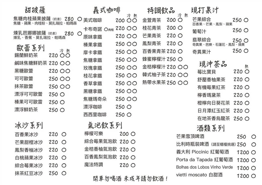 ▲空ㄟCafé 菜單:可使用手機掃碼點餐付款,菜單飲品有多樣特調果汁、咖啡和酒類,熱食有披薩、焗烤、鬆餅和炸物,用餐時間90分鐘。