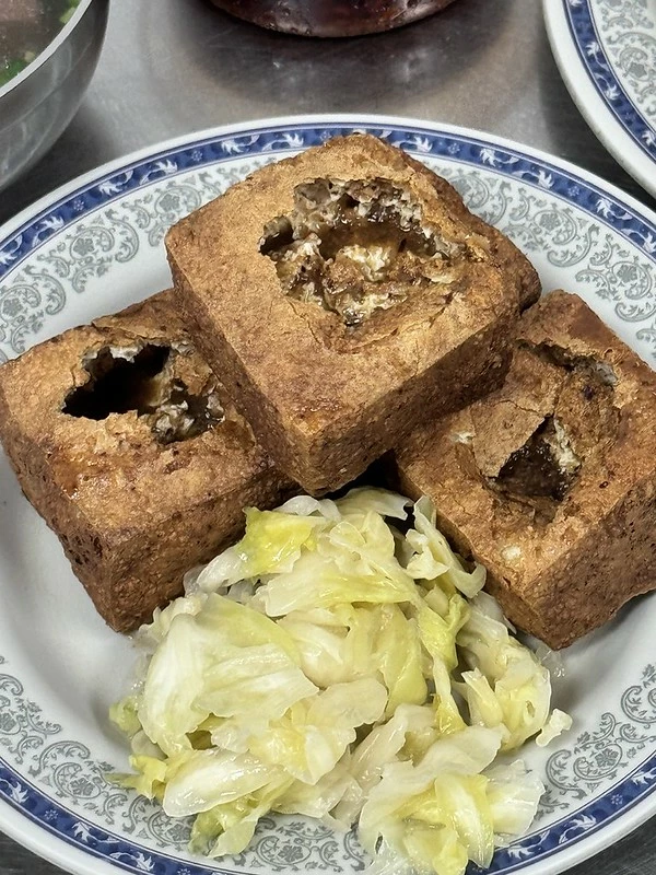 這家臭豆腐比一般略大外,也比一般略黑,是我喜歡那種整塊不切,在上面敲洞淋入醬汁的臭豆腐,搭配的是傳統口感爽脆微微帶酸台式泡菜。