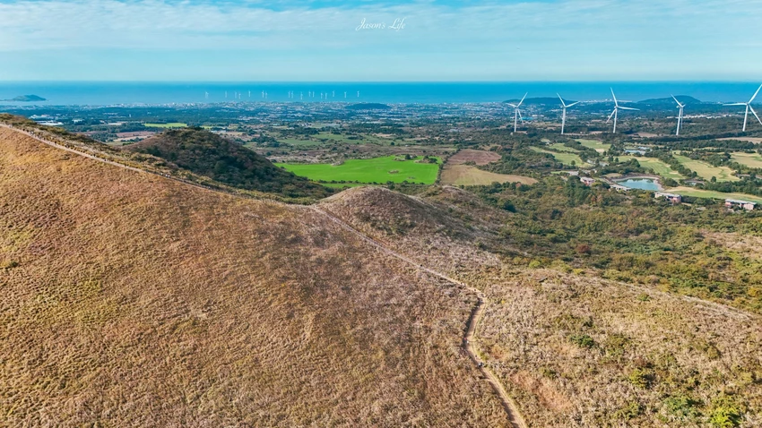咖啡廳位處小山丘,視野自然更廣。站在粉黛亂子草旁往外看,可遠眺晨星岳、大片蘆葦與風力發電機的風車群,近距離則是牧場與田野交織的景色。高低錯落的景觀,讓照片不只粉嫩,更多了濟州特有的野地美感。