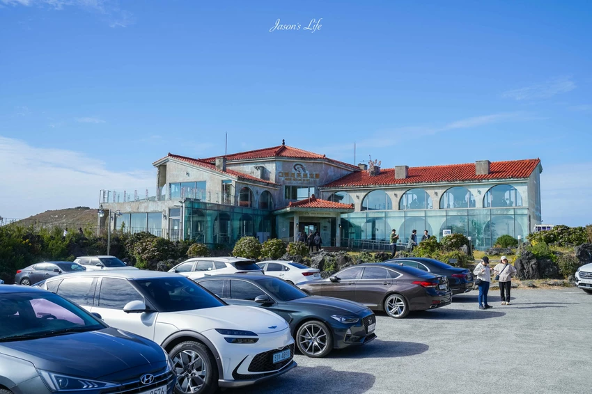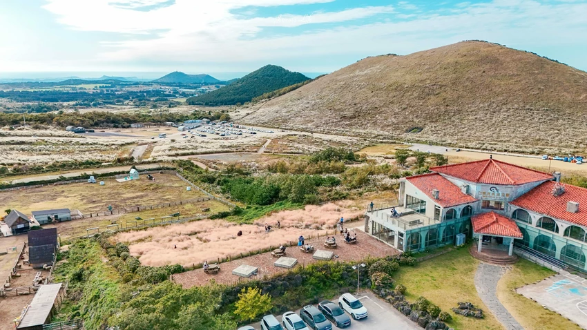 Saebil Cafe 位在濟州島腹地開闊的山坡上,由廢棄飯店改建而成。入口處仍保留舊飯店的名稱,外牆帶著歲月斑駁,彷彿中古世紀的石堡矗立在風中。抵達咖啡廳前會先穿過牧場與空地,盡頭便是附設的免費停車場,旅人一下車就能感受到濟州秋景的遼闊。