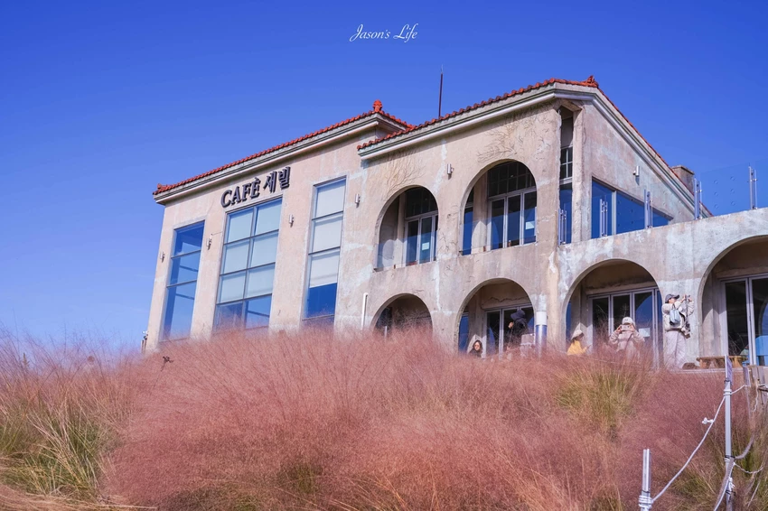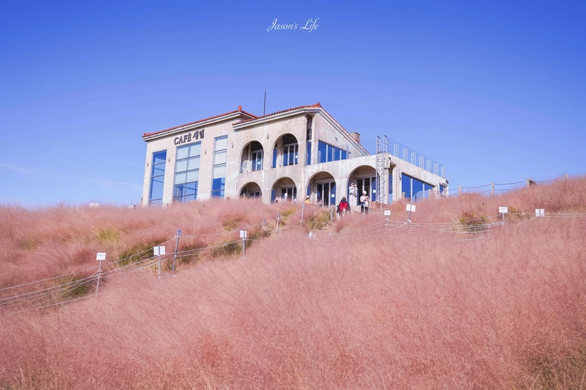 秋天的濟州被粉黛亂子草染成粉紅大地,而 Saebil Cafe 就藏在這片夢幻坡景裡。老飯店改建的咖啡館望向風車、蘆葦與小牧場,是最值得停下腳步的秋日秘境。