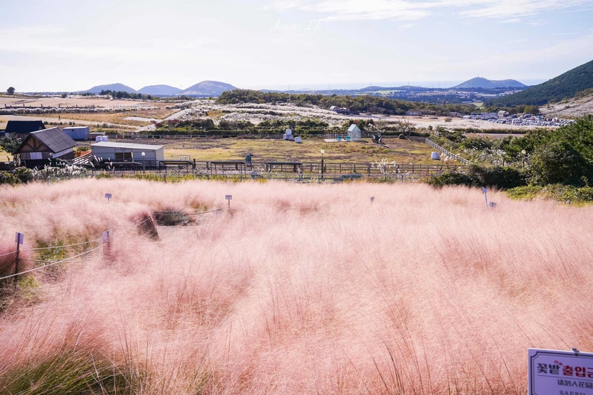 穿過用餐區後,真正的夢幻場景才正式展開。從九月至十一月,Saebil Cafe 後方的粉黛亂子草會大面積綻放,粉紅色從坡地一路鋪往遠方,形成浪漫的粉色地毯。這裡是濟州秋季最熱門的拍照點,幾乎每一步都能拍出像明信片的畫面。