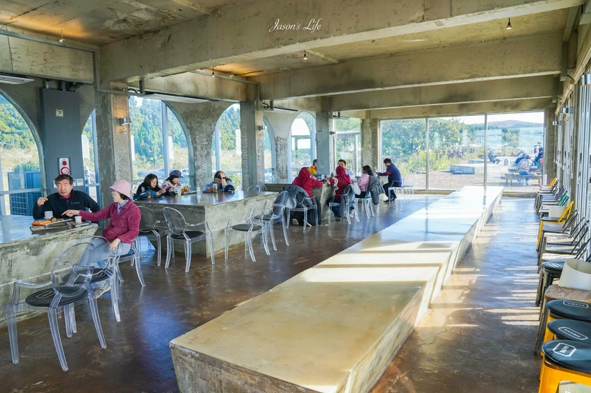 走進室內,老宅結構搭上現代感的高挑空間,巨幅落地窗引光而入,整個環境遼闊明亮、沒有壓迫感。室內提供多款自製烘焙點心與飲品,咖啡香氣在空間裡慢慢散開,是很適合坐下休息的地方。