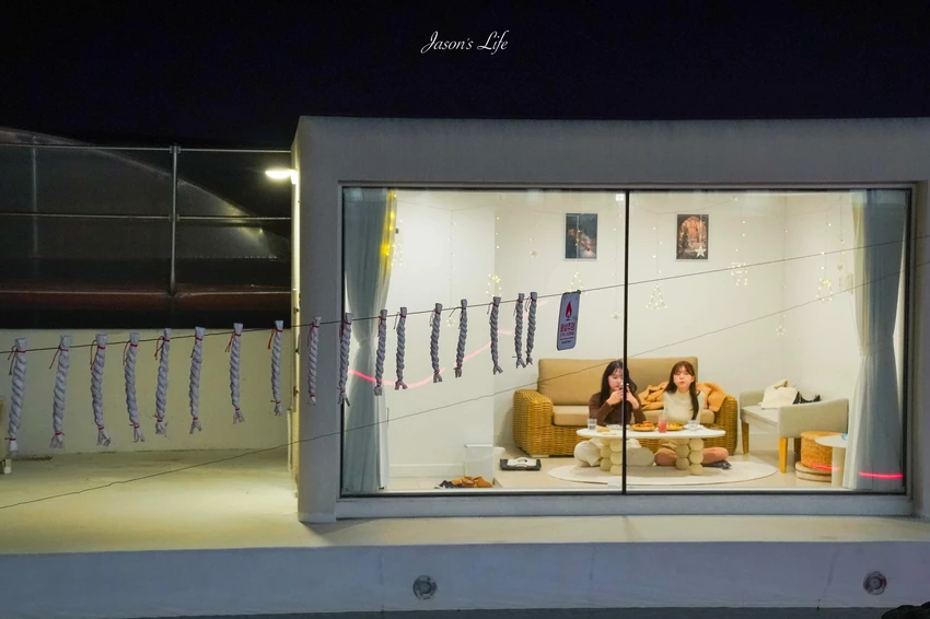 FloWave 的座位採自由選位。弧形室內空間搭配大面積玻璃帷幕,使採光與戶外造景直接延伸至室內。戶外的火山造景可供拍照或綁上落火棒,是白天與夜晚都很受歡迎的區域。若提前於 Naver 預約包廂,可享有更獨立的視野與完整造景角度。