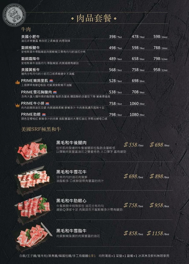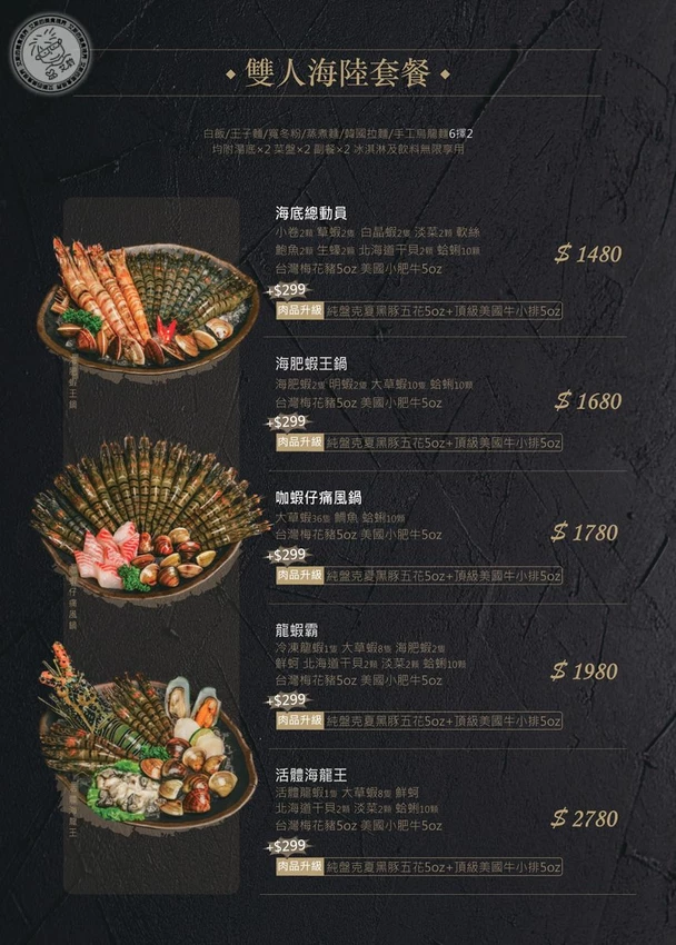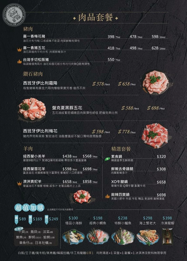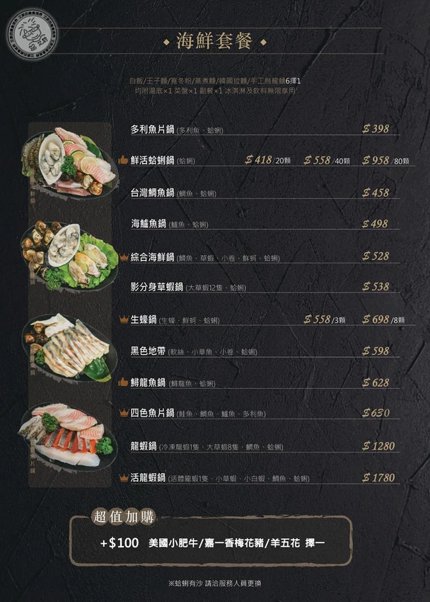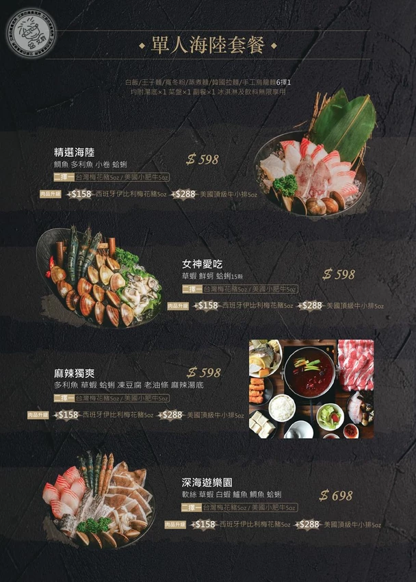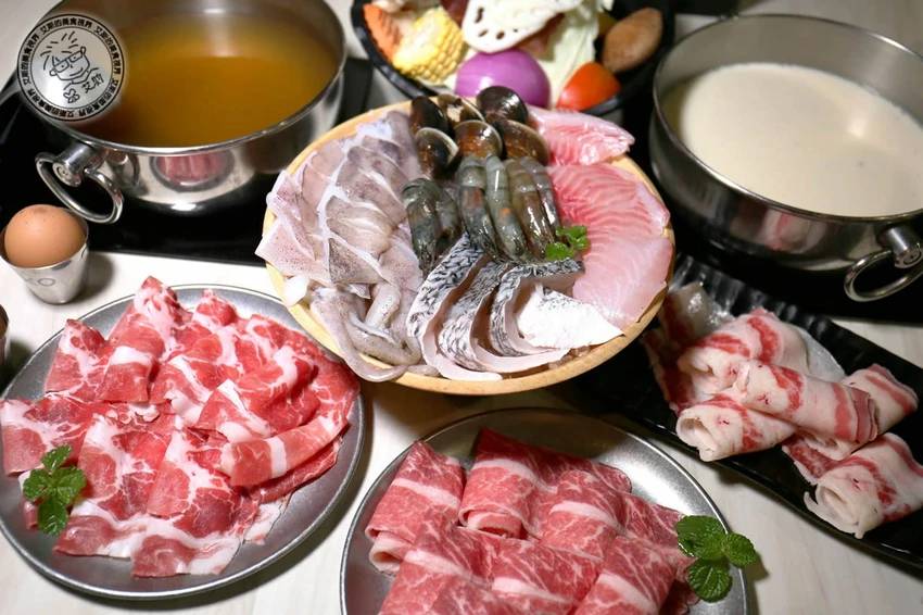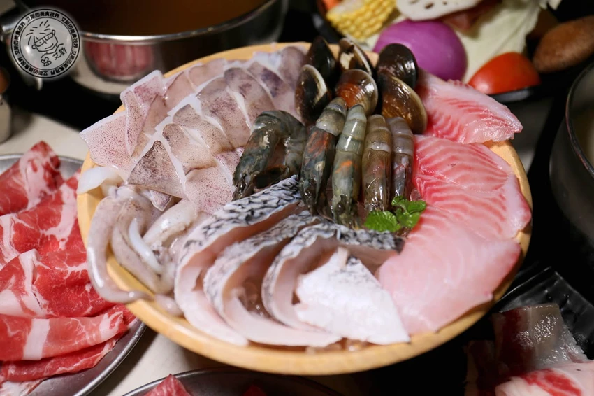 Prime 牛小排油花細緻,入口嫩度極佳,與松露牛奶湯頭相當契合;伊比利梅花豬香氣明顯,口感富有彈性,與剝皮辣椒鍋的層次相得益彰。若想一次吃到肉與海鮮,可選精選海陸或深海遊樂園,魚類、蝦類、小卷等皆新鮮度高,是想補海味時的好選擇。