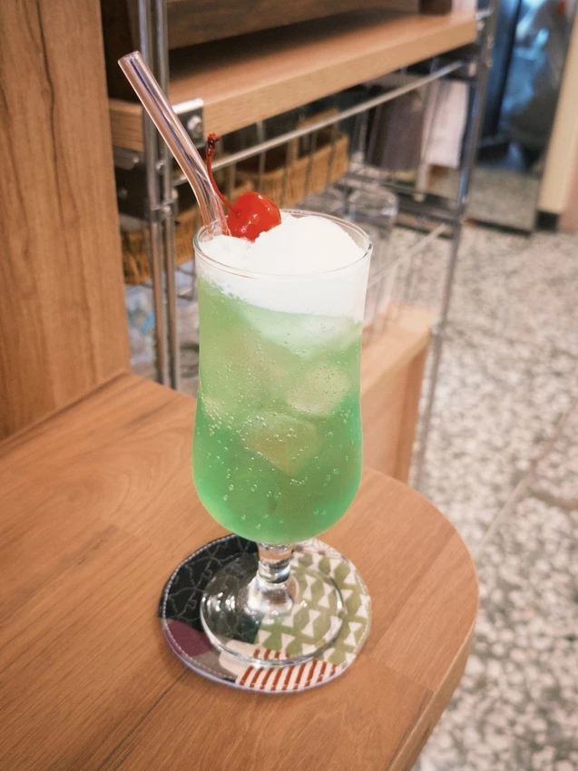 桃樂古早味紅茶清爽帶甘,與鹹食搭配不搶味;哈密瓜蘇打加上一球冰淇淋,則有濃濃昭和感,讓整個用餐體驗更完整、更具喫茶店特色。