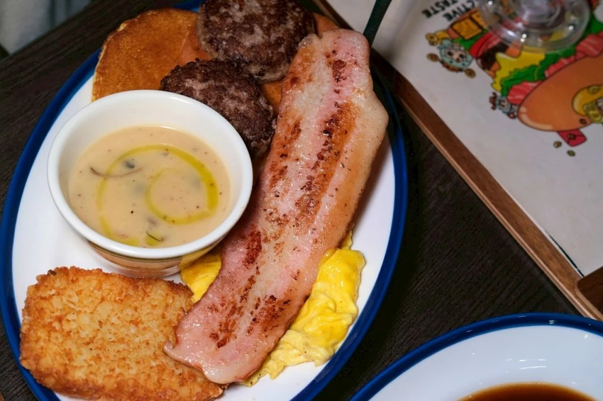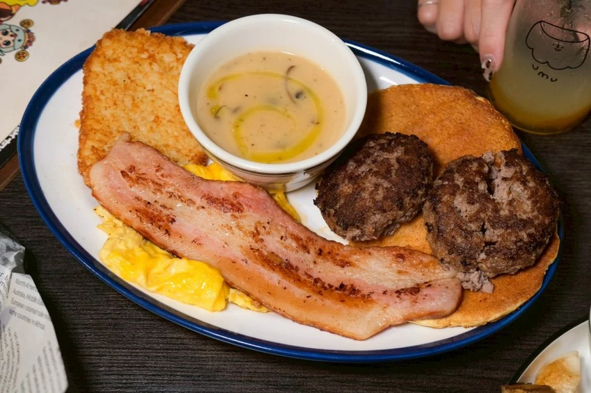 ▼如果是肉肉控推薦加州女孩鬆餅,一次可以吃到兩顆漢堡排和超大培根,使用台灣溫體牛手打的漢堡肉,現點現煎咬下整個超過癮,搭配美式鬆餅、炒蛋、薯餅和歐氏菌菇濃湯,吃這一份直接飽到晚上!