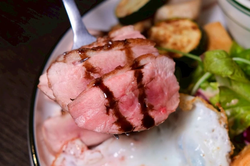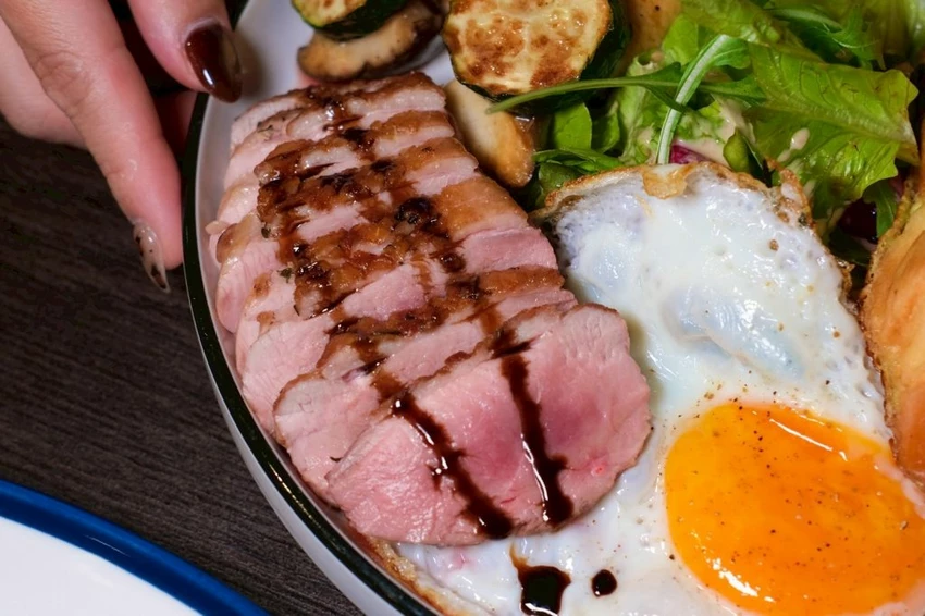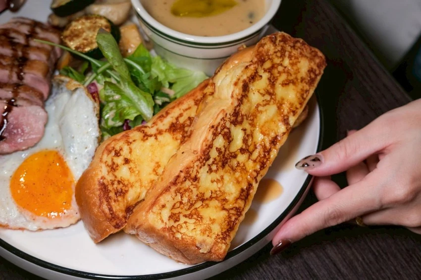 ▼不能吃牛的話可以點派對鴨胸早午餐,看看這鴨胸會不會太粉嫩,咬下去也是柔軟不乾柴,還有搭配生菜、歐氏菌菇濃湯、太陽蛋和法式吐司,激推法式吐司口感帶點Q彈,而且吃起來超香我好愛!