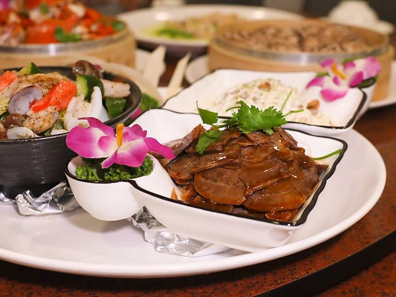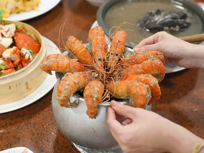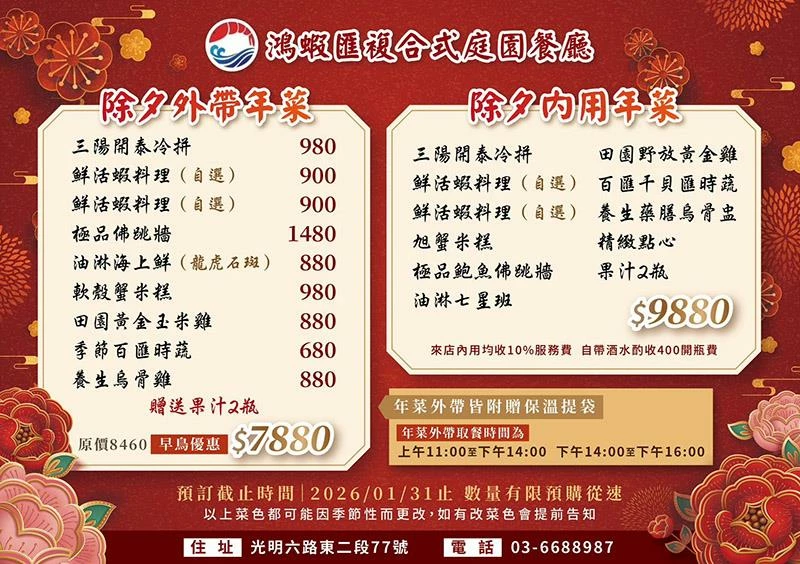 餐廳年菜外帶以整桌組合呈現,料理當天簡單加熱即可享用,內容包含冷拼、泰國蝦料理、海鮮米糕與佛跳牆等。若選擇現場內用,還能享冰淇淋吃到飽,適合家庭聚餐。