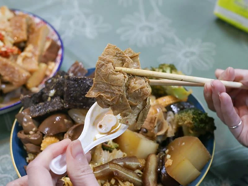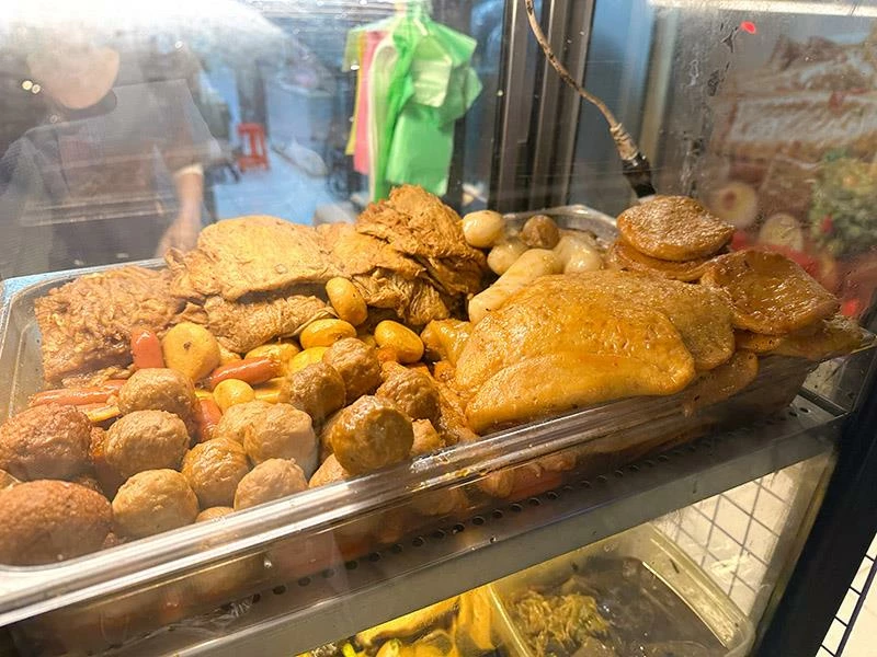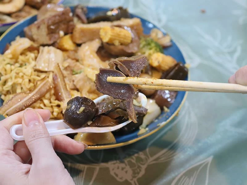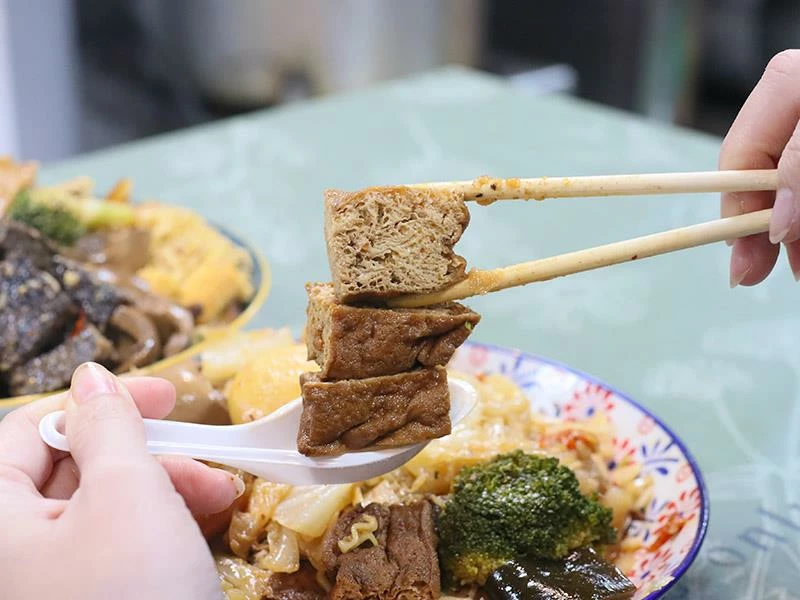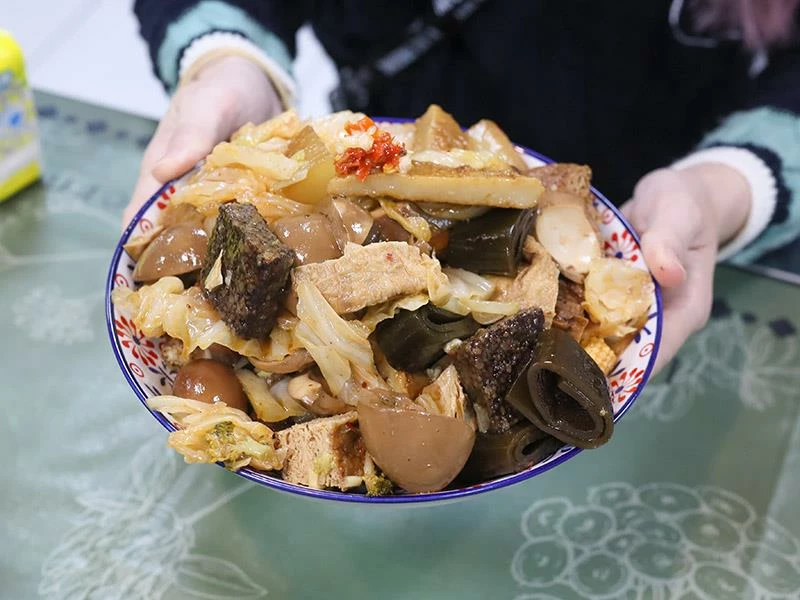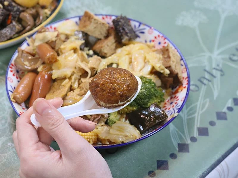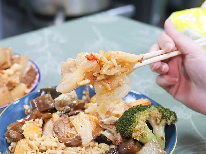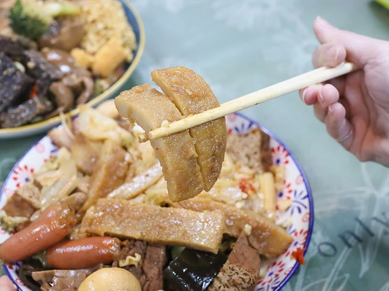 豬皮的彈度非常明顯,不黏牙、不過油,是人氣必點之一。豆包對滷汁的吸附力極佳,入口時能感覺到香氣層層釋放。蔬菜類表現更是出色——玉米筍甜味自然、高麗菜保持爽脆、花椰菜吸汁後清爽不膩,是均衡整份滷味的重要角色。