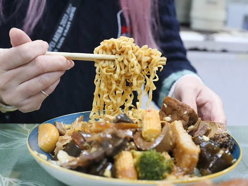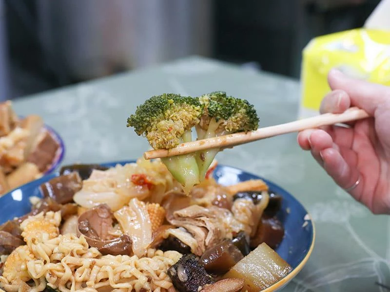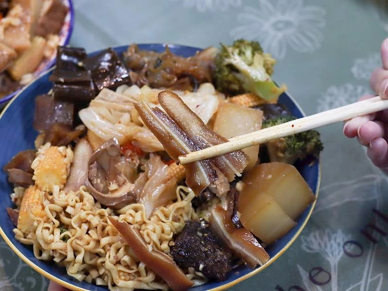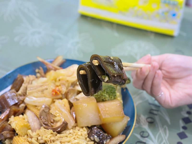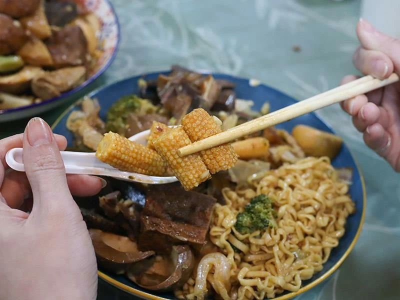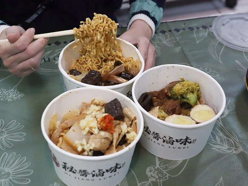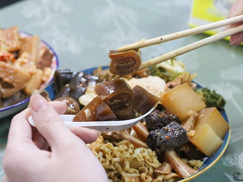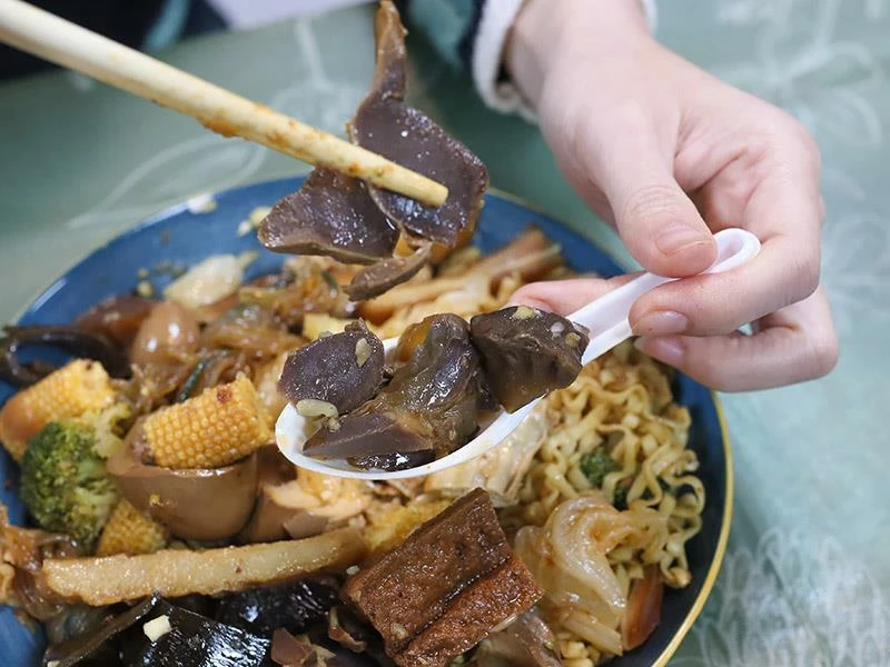 豬皮的彈度非常明顯,不黏牙、不過油,是人氣必點之一。豆包對滷汁的吸附力極佳,入口時能感覺到香氣層層釋放。蔬菜類表現更是出色——玉米筍甜味自然、高麗菜保持爽脆、花椰菜吸汁後清爽不膩,是均衡整份滷味的重要角色。