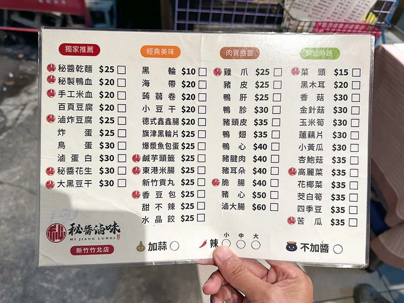 秘醬滷味竹北店鄰近博愛街,傍晚便開始聚集排隊人潮。食材當天現滷、不添加防腐劑,醬汁以慢火熬製,呈現乾淨溫順的醬香,是竹北居民下班後常見的滷味選擇。