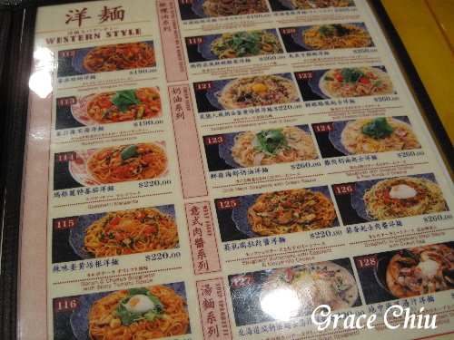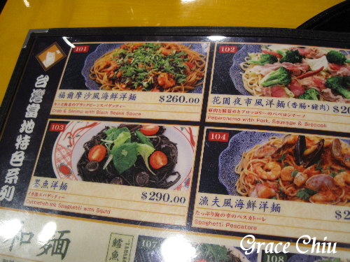 翻開菜單還真是琳瑯滿目,除了普遍的蕃茄.奶油.橄欖油...等系列外,也有和風的明太子.鱈魚子.醬油系列,另外還出了台灣當地特色系列~福爾摩沙風.花園夜市風,可以加價搭配成不同套餐,想同時吃看看不同口味也有洋麵1+1套餐可以選,套餐裡含二個半份洋麵.湯.甜品或飲料,這個1+1套餐的洋麵都是店家搭配好的組合,有A.B.C三種設定供選擇.