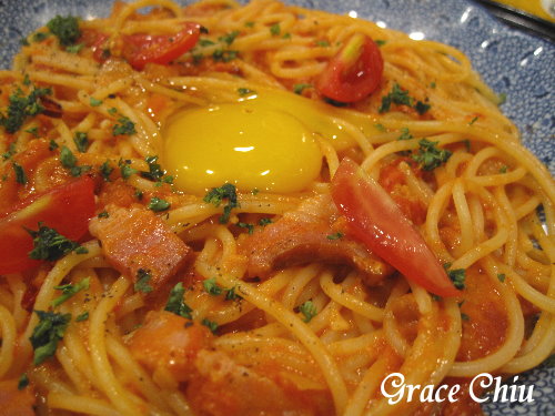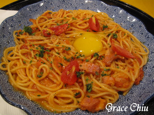 辣味蛋黃培根洋麵,蛋黃拌開後麵條感覺更滑口,帶點微辣的滋味讓人胃口大開,帶有些厚度的培根吃起來更多了嚼勁.