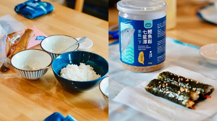 我們今天的活動內容包含花蓮七星潭漁業介紹、季節魚種認識、及鮮魚點心品嚐,自己DIY做海苔飯卷,大人小孩都玩得超開心!