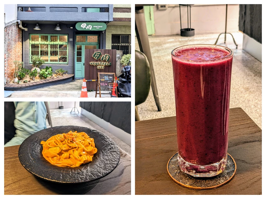 餐廳位在很有歷史的老宅內,經過門口就被熱帶植物造景和復古綠窗深深吸引,餐廳取名毋肉(無肉)就如同字面意思是間蔬食餐廳,他們的義大利麵和燉飯都很有特色,每道義大利麵的配菜和麵體也呈現豐富的變化,雖然是間剛開幕沒多久的小店,但完全能感受到老闆的用心。