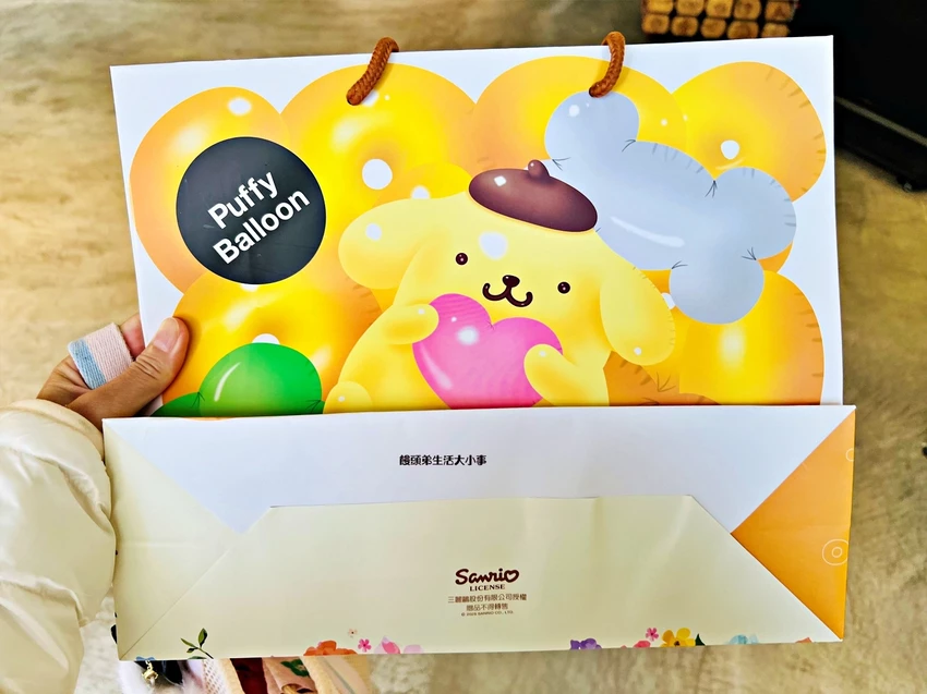 完成現場指定打卡,即可獲得美樂蒂、酷洛米貼紙,另外還能領到限定紙袋。正面是 Sanrio 全明星集合,背面則是布丁狗的專屬圖案,設計可愛到讓人想多拿幾個回家收藏。