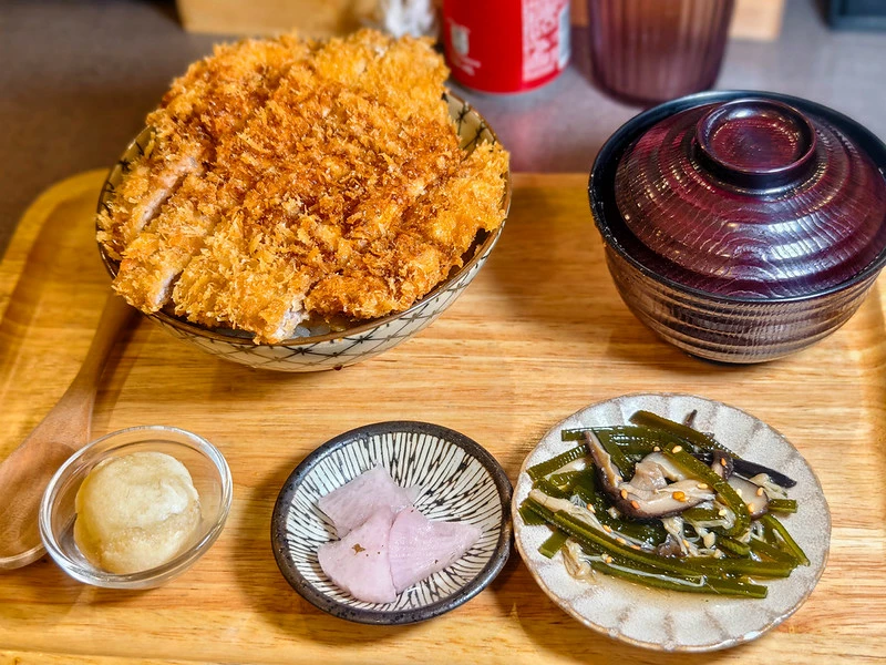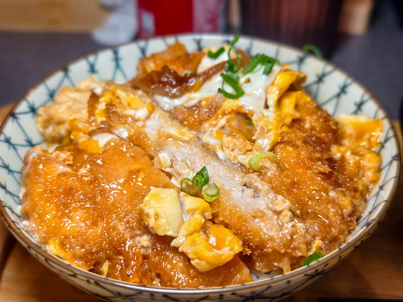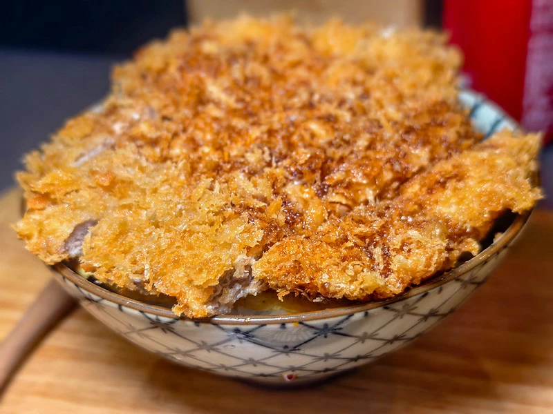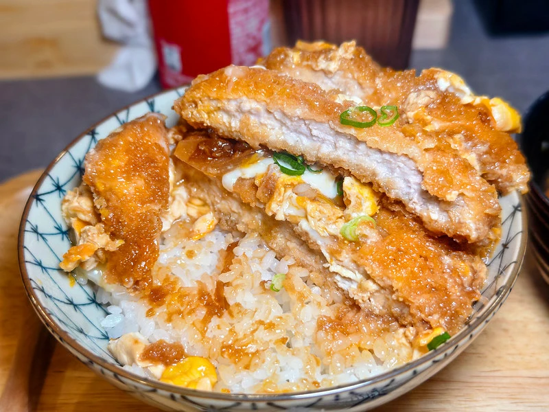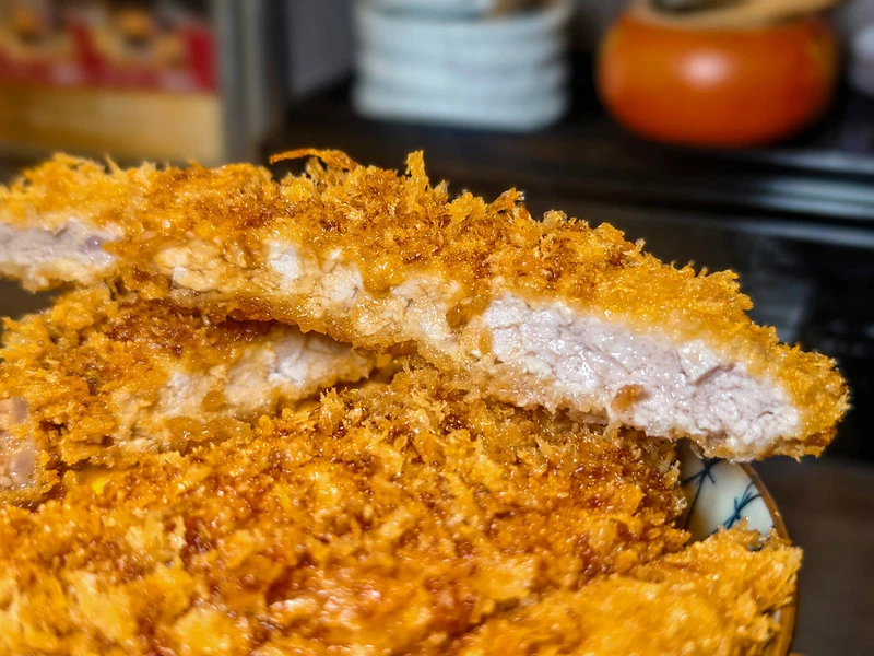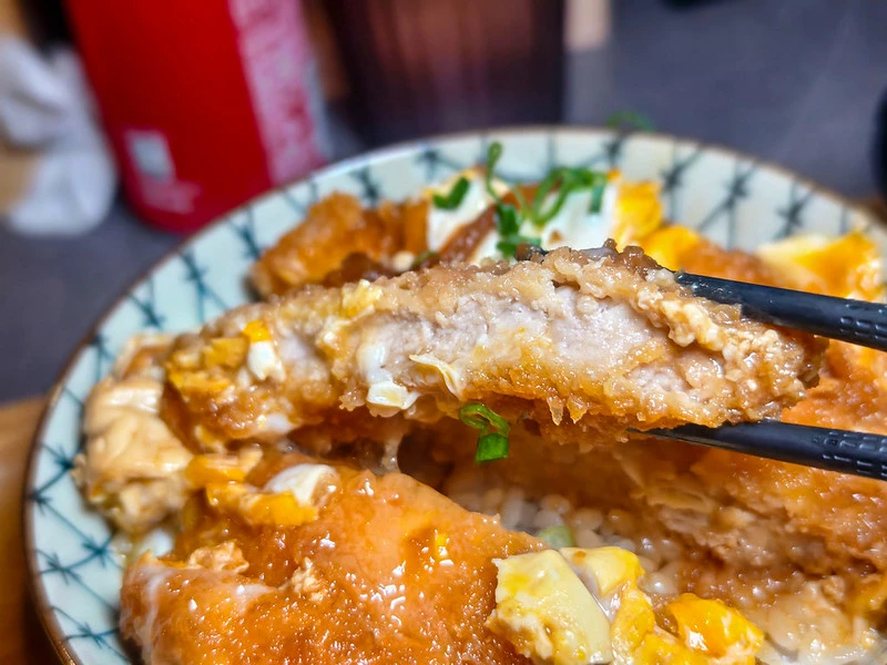 豬排丼上桌時能看到整碗鋪滿切片豬排。里肌肉經熟成處理後軟嫩度提升,咀嚼仍保有些許肉汁。麵衣厚薄適中、口感清脆,底層搭配蛋皮,可自行選擇全熟或半熟,與白飯一起入口相當順口。