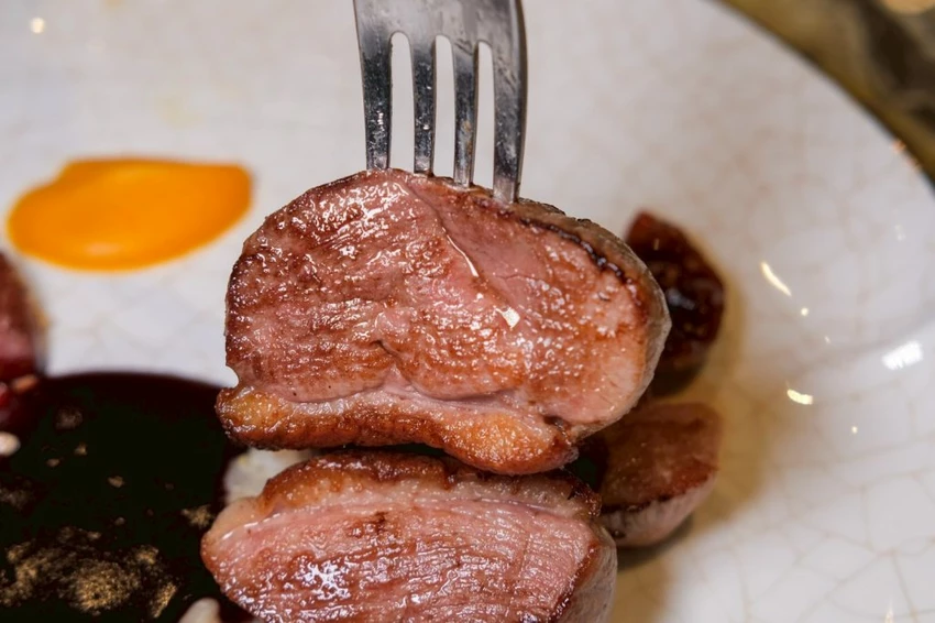 ▼主餐可以吃到日本 A5 和牛 & 櫻桃鴨胸,兩款肉肉一次滿足,醬汁超講究直接在鐵板上現場熬煮,加入了紅酒×桑葚熬製呈現濃厚果香,藜麥薏仁展演燉飯,肉肉也毫不馬虎,鴨胸以白蘭地點燃後增添酒香,肉質軟嫩好咬,和牛則煎到外酥內柔軟,每一口都讓人大驚豔!