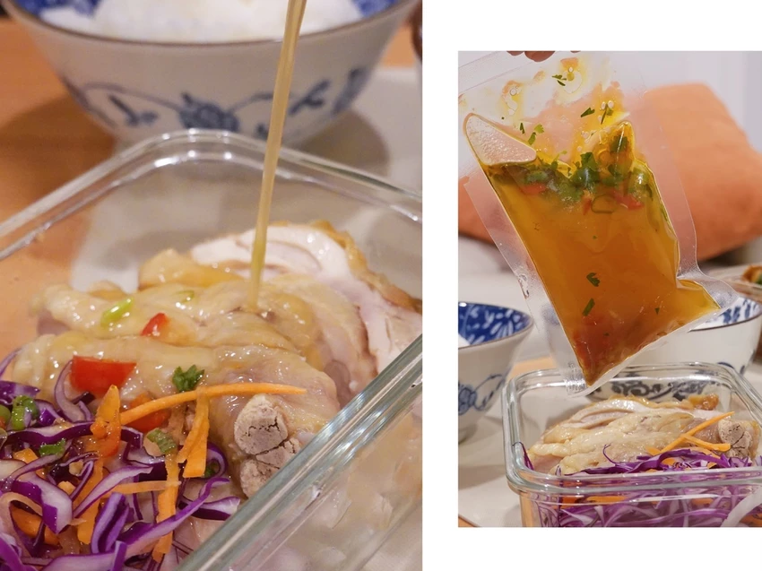 椒麻雞以板烤方式取代油炸的烹調方式,更為健康但美味絲毫不減。而且醬汁部分也很貼心的採分開包裝,不僅不會造成容器因為運送所濕黏,也可以依照個人口味去添加。