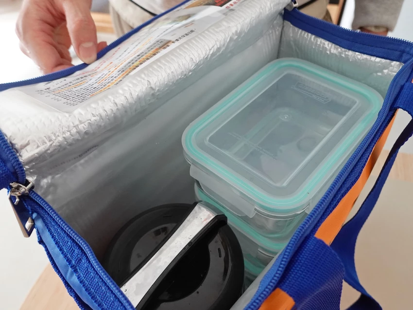 四菜一湯被穩妥的放置在保溫袋內,看起來這尺寸應該是有精準丈量過,可以減少車輛行駛所造成的晃動潑灑,看起來也很整齊、賞心悅目。