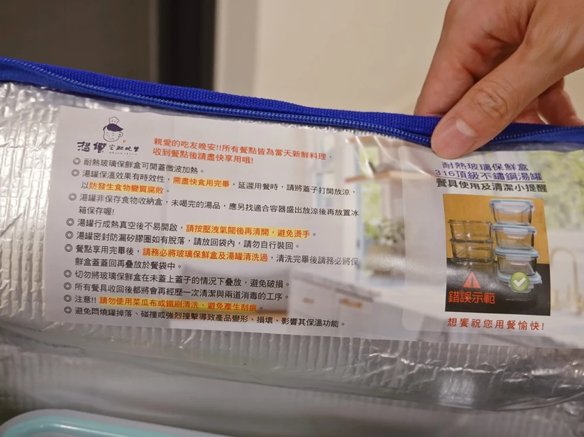 打開保溫袋上頭有注意事項,包括用餐的注意事項,以及清潔餐具方式等等,很是貼心。