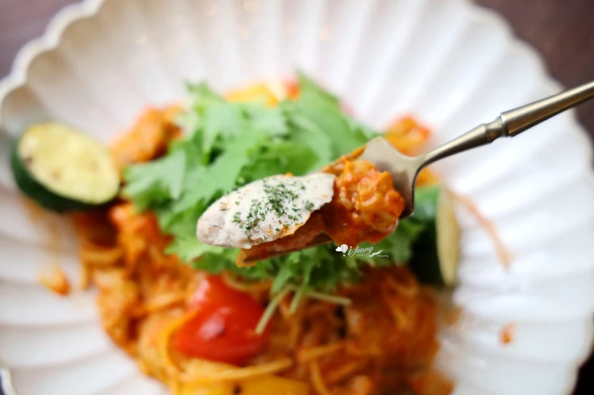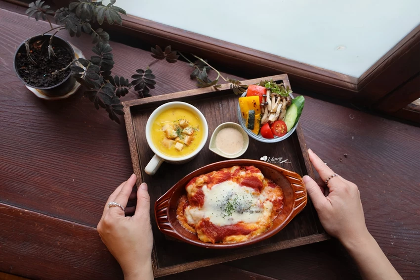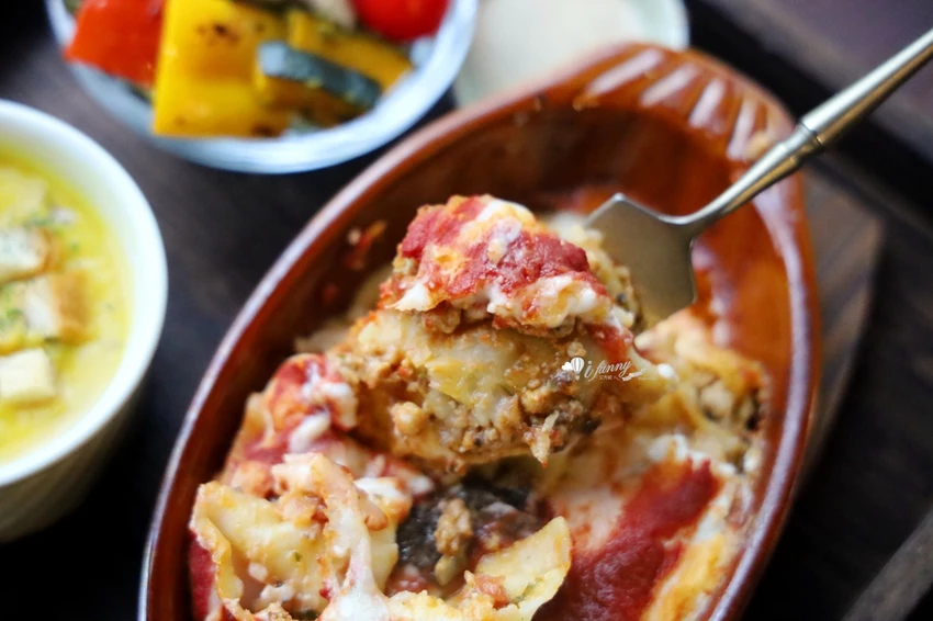 「松露焗烤吐司」售價250元,以金黃起司、蛋沙拉與黑松露層層堆疊,口感奢華豐富。「庭園紅醬義大利麵」售價380元,使用濃稠番茄紅醬充分包覆麵條,搭配兩種口味的軟嫩雞肉,展現出日式洋食的細膩與精緻。單點的「經典焗烤肉醬千層麵」售價280元,紅白雙醬與起司結合,口感層次豐富。