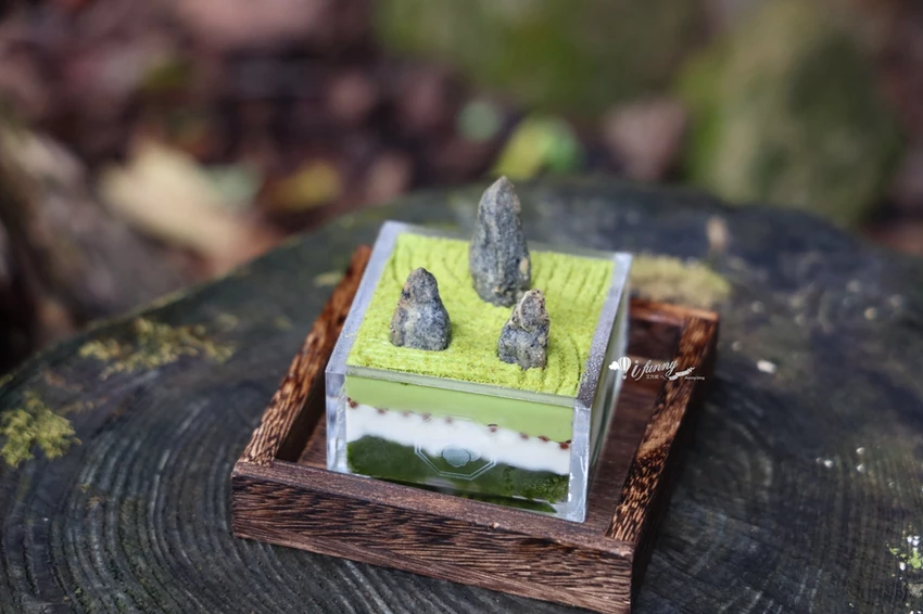 箱庭 山本屋的甜點最具話題性,尤其是將日式造景藝術融入食物中的「枯山水盤」,售價380元並附贈冰抹茶。這道甜點以白砂般的白色紋路盤子為基底,將抹茶慕斯與蛋糕打造成蓬萊山,紅豆紫蘇大福象徵蘚苔巨石,每一部分皆是可食用的藝術品,為顧客帶來視覺與味覺的雙重享受。