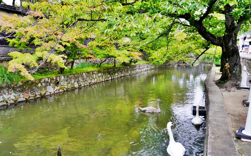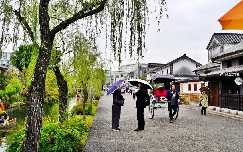 倉敷川流經美觀地區的中心,河畔兩旁種植了許多隨風搖曳的柳樹,與白壁古宅倒映在水面上,形成了一幅詩情畫意的風景畫。旅客可以選擇購票搭乘傳統的川船,以貼近水面的視角欣賞沿岸風光,隨著船伕的撐篙緩緩前行,彷彿穿越時空回到了江戶時代。若是不習慣在眾人目光下搭船的旅客,也可以選擇在岸邊散步,或是搭乘充滿復古風情的人力車繞行街區。此處也是許多新人拍攝婚紗的熱門景點,幸運的話還能遇見身著傳統和服的夫婦或新人,讓整體的日式氛圍更加濃厚。
