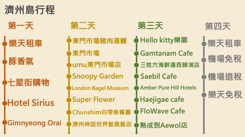 若遇天氣因素班機提前,樂天租車提供退費服務,相當人性化。離境前別忘了在機場免稅店做最後衝刺,這裡有可愛的橘子主題選物店與各式伴手禮,機場亦設有專人退稅櫃檯,可選擇退美金或韓幣,方便快捷。