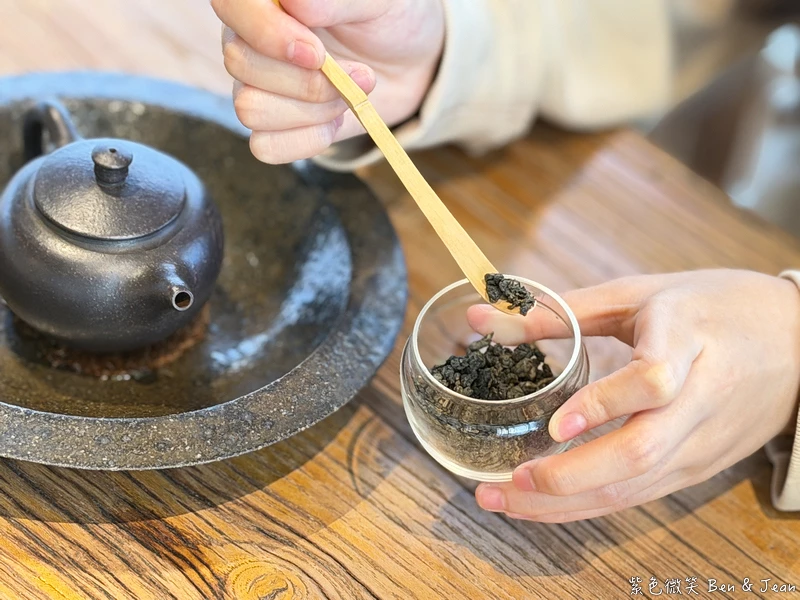 也可以利用茶則,先將茶葉放在上面,觀看茶葉再聞香一下,最後再倒入茶壺中