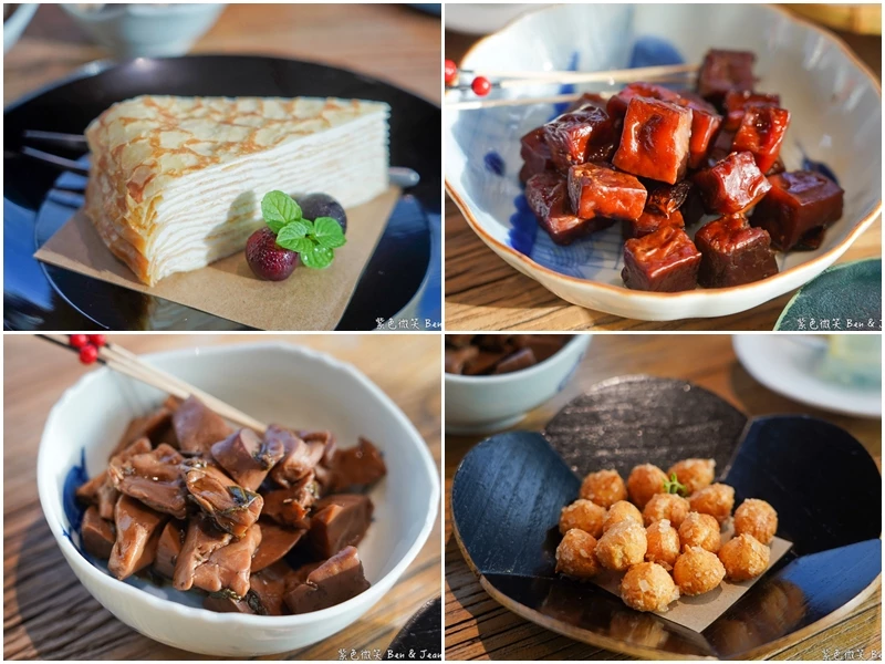 千層蛋糕、豆干、茶香脆菇、日式小泡芙