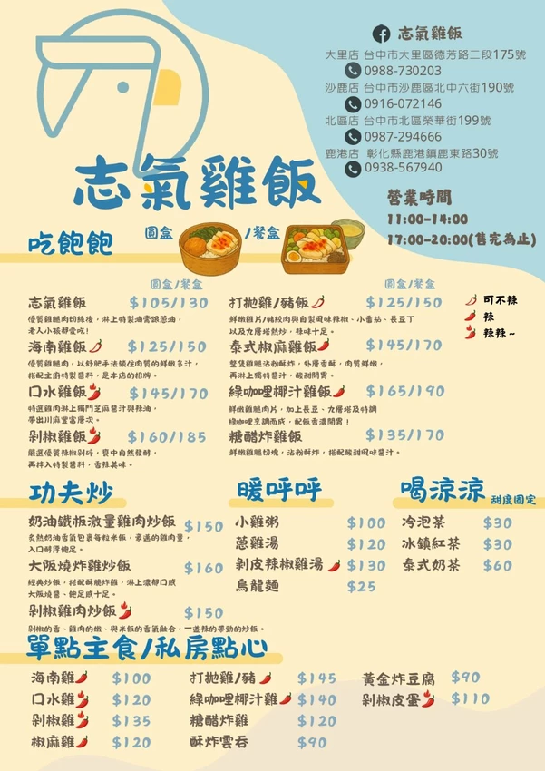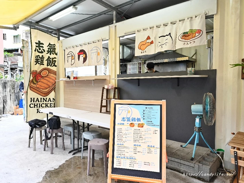 志氣雞飯目前台中共有四間分店,分別位在台中大里、沙鹿、北區及彰化鹿港,糖糖這次是來到位在台中北區的志氣雞飯榮華店,店址就位在榮華富櫃市集中,營業時間為早上十一點至下午兩點,下午五點至晚上八點,週日店休