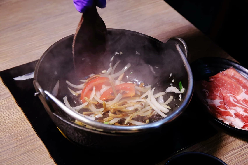 在肉多多,服務人員會親自桌邊炒料的服務,包括把洋蔥、肉片等炒得香香的,再倒入高湯