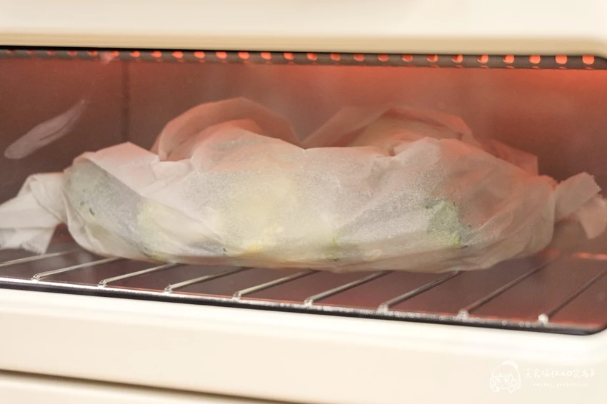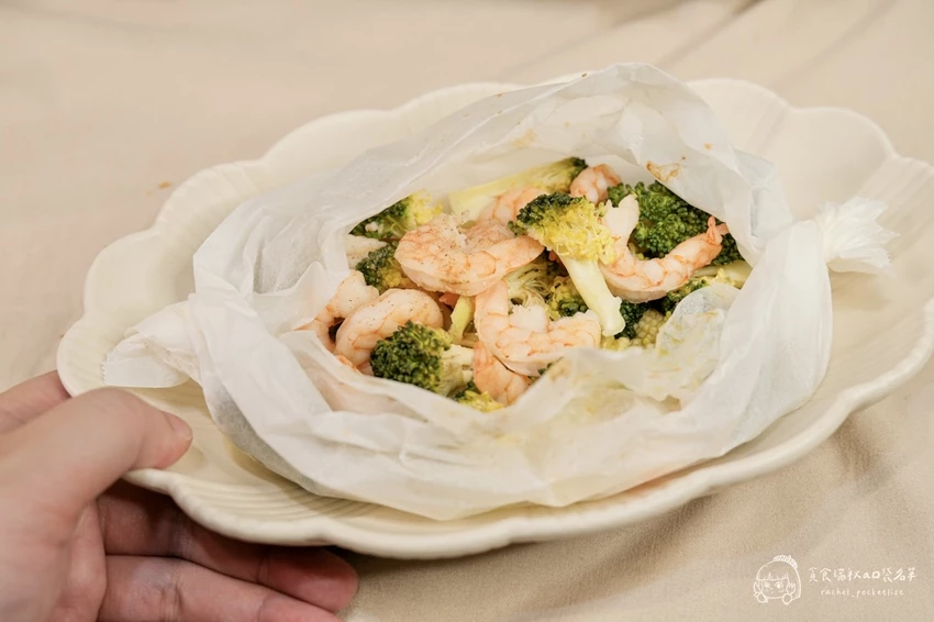 想要吃得健康又美味,這台烤箱也能輕鬆勝任「紙包料理」。將鮮蝦仁與各式蔬菜鋪好,用烘焙紙包覆後放入烤箱,設定 180 度烘烤 15 分鐘即可出爐。遠紅外線的穿透力讓蔬菜熟度恰到好處,保留了鮮甜水分而不乾硬,蝦肉則維持 Q 彈口感,無需複雜烹調就能享受蒜香四溢的海味大餐。