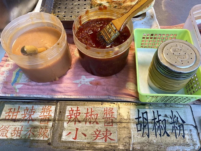 蔥油餅煎好了,老闆會放在盤子上讓你自個調味
