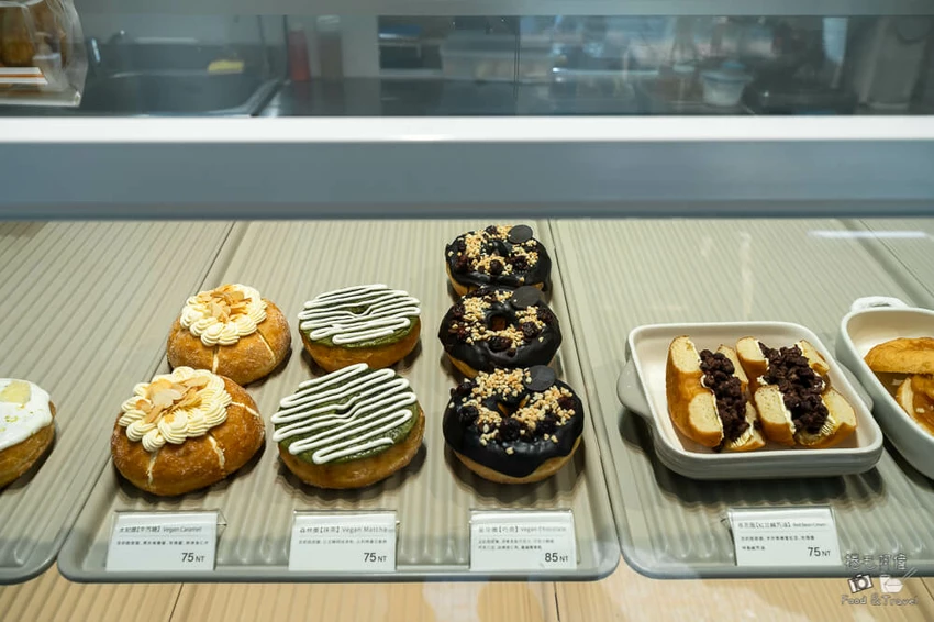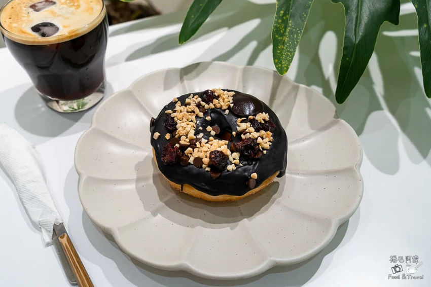 店內主打全素食的甜甜圈,口感卻一點也不輸傳統口味。推薦甜食控必點「星空圈」,濃郁的巧克力醬裹滿一半的甜甜圈,上方撒上酸甜的洛神花乾與脆口堅果點綴。入口能感受到巧克力的苦甜與果酸交織,層次豐富且不膩口,是下午茶的最佳良伴。