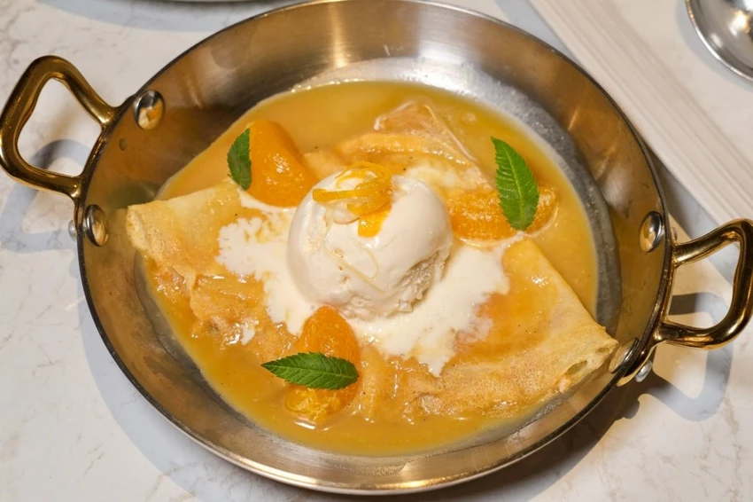 ▼甜點的水準完全沒話說~法式香橙可麗餅是近期吃到最愛的鐵板燒甜點,柔軟的餅皮包裹著多汁橘肉,再搭配柑曼怡干邑酒和哈根達斯香草冰淇淋點綴,酸酸甜甜的滋味好討喜!