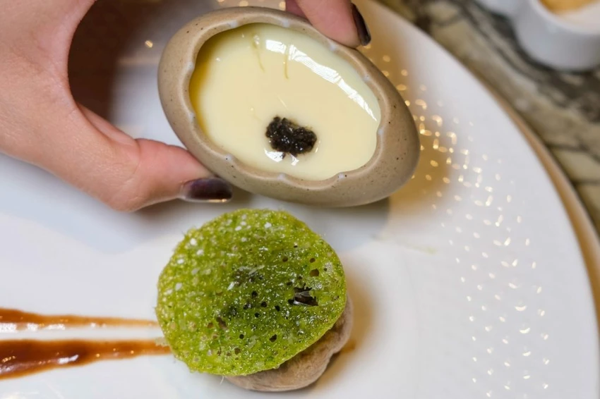 ▼美到像幅畫的田螺洋菇&松露蒸蛋,蘑菇田螺帶有濃厚醬香,佐巴西里蕾絲餅的薄酥添色,滑嫩蒸蛋則吃得到松露的香氣!