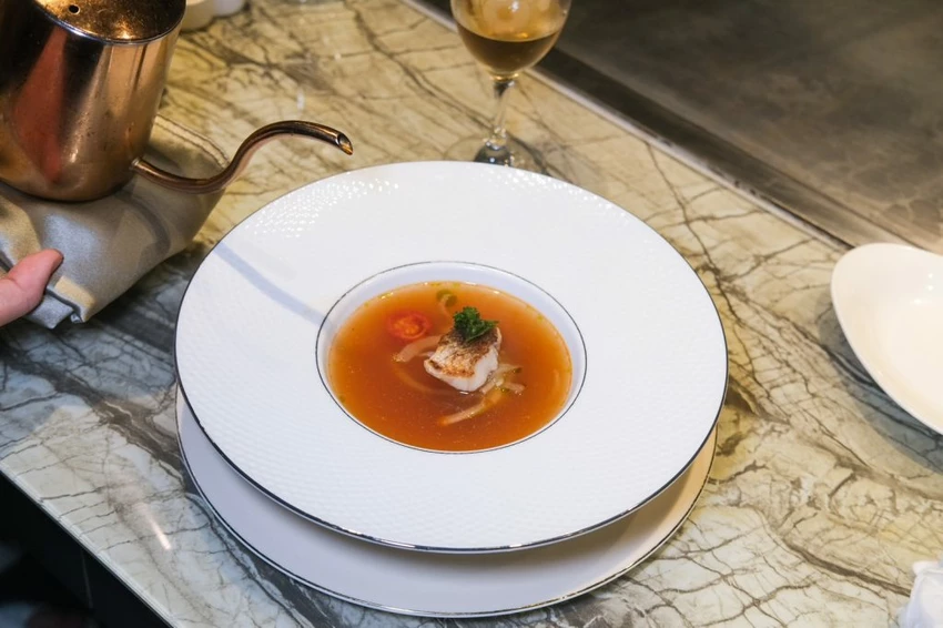 ▼炙燒鮮魚海鮮湯會在桌邊倒入高湯,酸中帶甜的番茄香氣飽滿,配上細緻的魚肉相當加分,另一款雞肉巧達濃湯更是濃郁討喜!