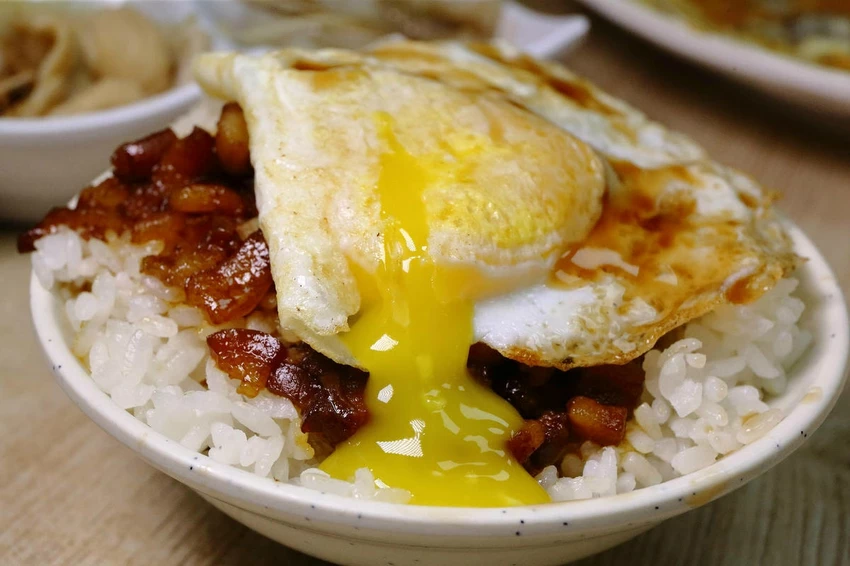 將半熟蛋的蛋黃戳破,濃郁的蛋液流進米飯和滷肉中,與鹹香的滷肉飯結合